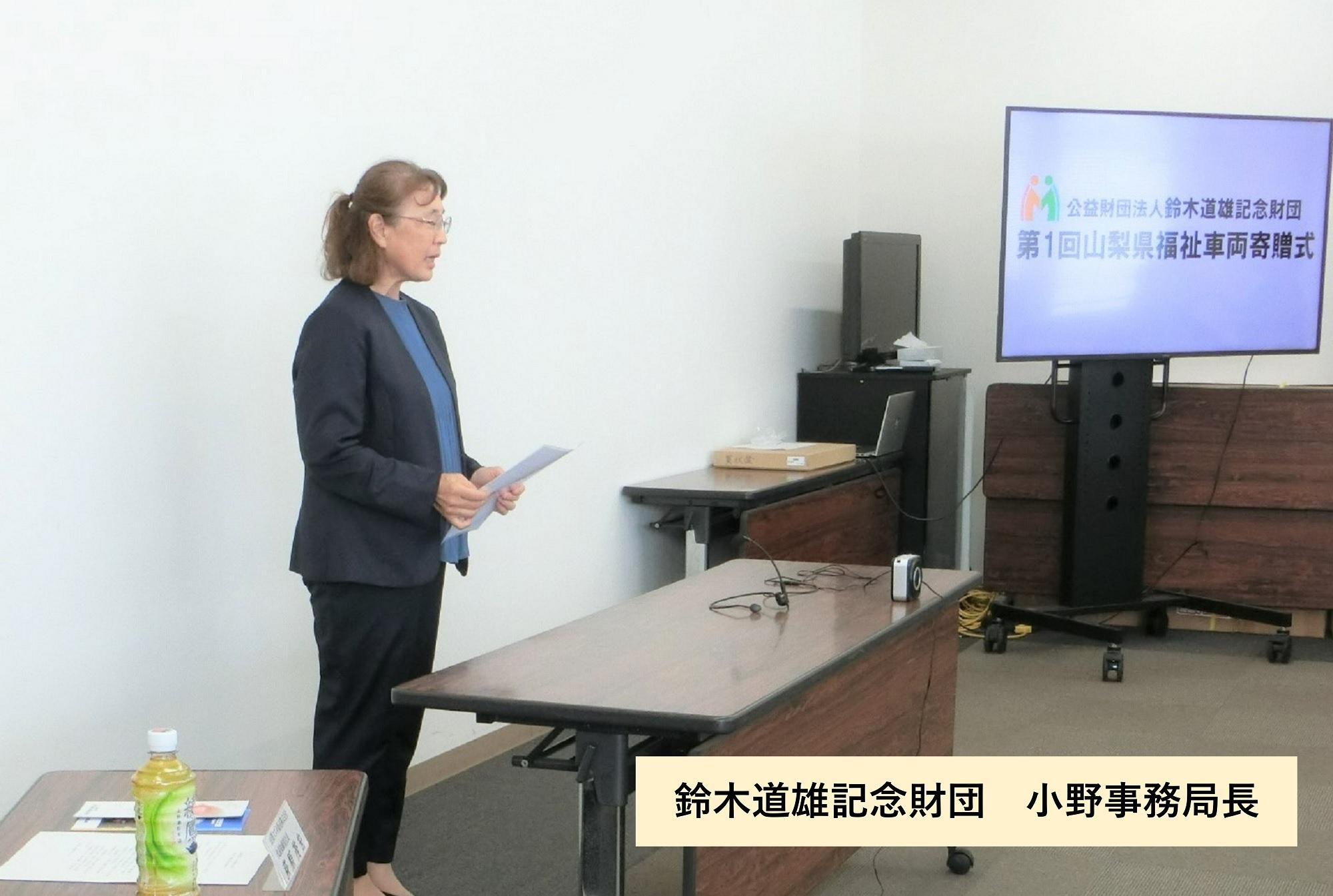 寄贈式では初めに、当財団鈴木修理事長に代わり小野事務局長が理事長挨拶文を読み上げ、続いて山梨スズキ販売株式会社 代表取締役の荻原社長より、寄贈先10法人の代表者へ目録が贈呈されました。![]()